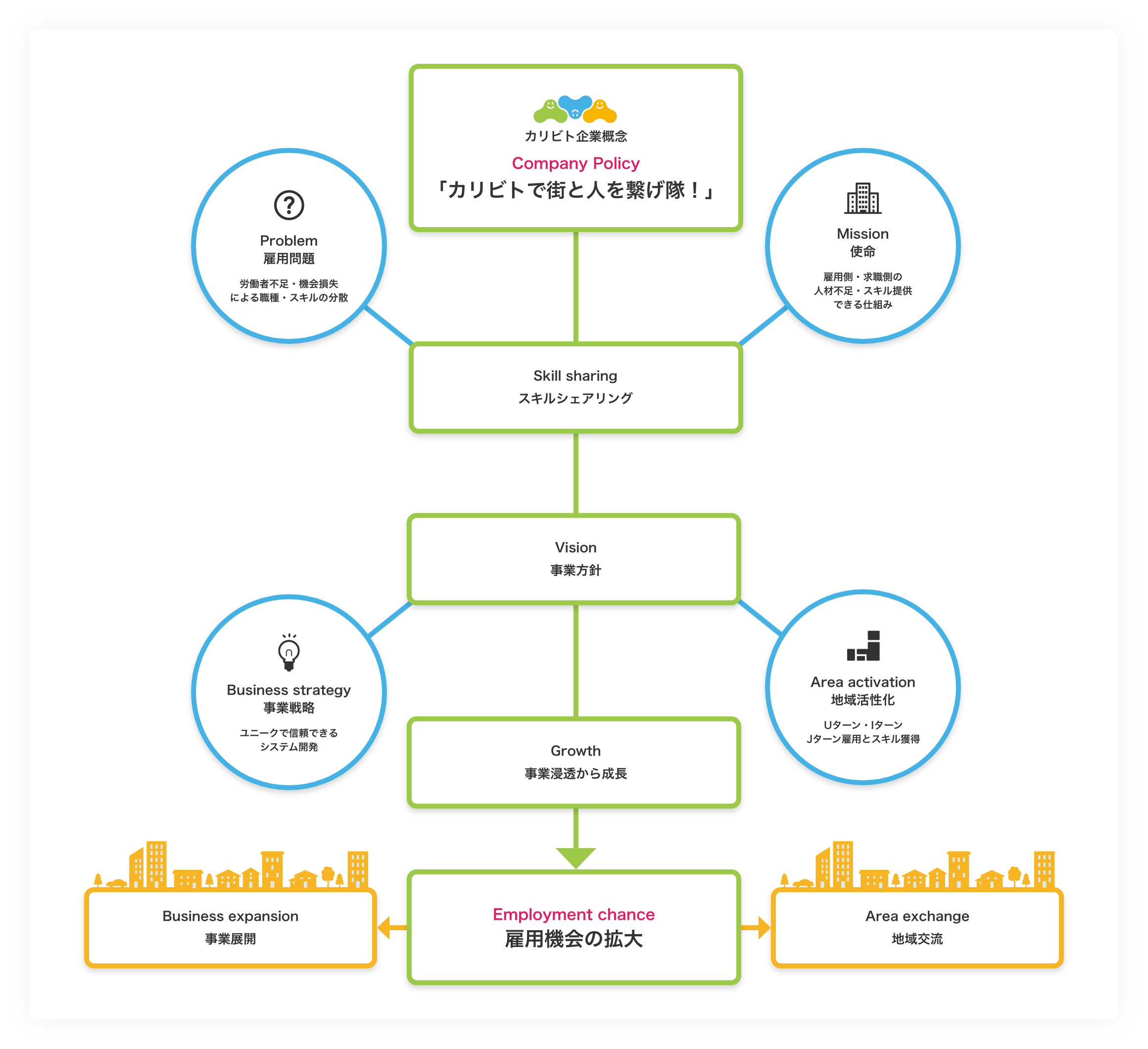 労働者不足・機会損失による多種多様な職種・スキルを、都心一極集中ではなく地方都市においてもベストシェアリングできるマルチプラットフォームの開発・浸透・共有・成長により雇用拡大を使命とします。